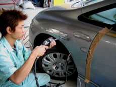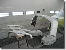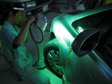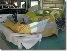 塗装ブースにて塗料を吹き付けます。塗料は車種や走行年数による色あせなどを考慮し調製したものを使用します。 |